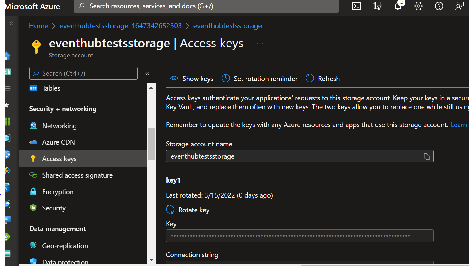 Azure Storage Account Connection String. This string keeps position and state information (what LogRhythm has collected so far from each Event Hub). The Event Hubs beat will use this storage account to create the storage container, if it is not already configured in the Azure portal within this storage account.