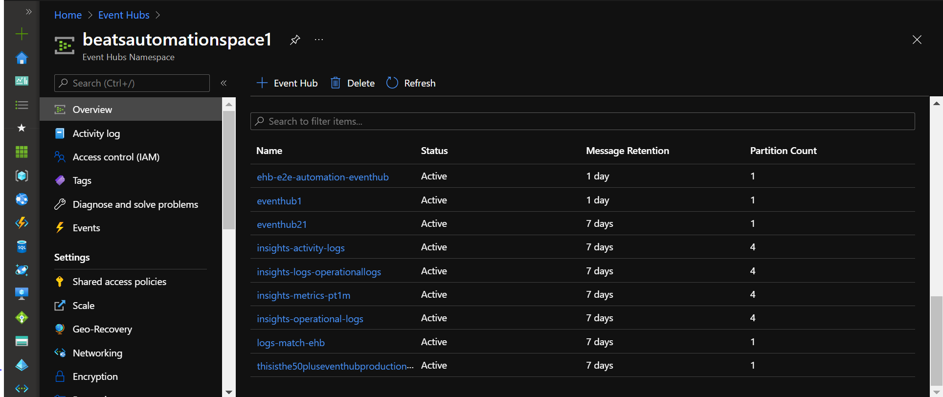 The overview opens, showing a list of all Event Hubs in the Namespace.For more information on creating an Event Hubs Namespace, see https://docs.microsoft.com/en-us/azure/event-hubs/event-hubs-create.