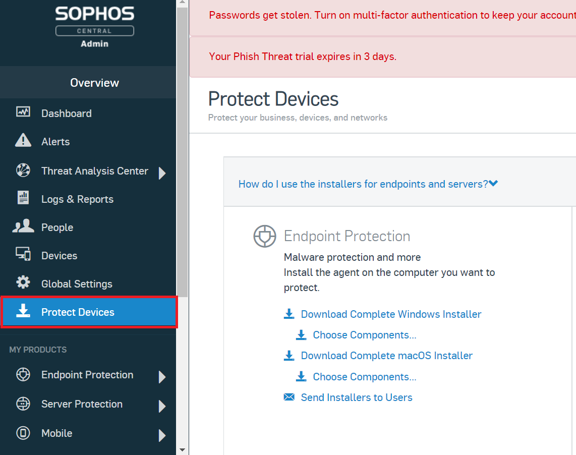 - From the Sophos web console, in the menu on the left, select Protect Devices.