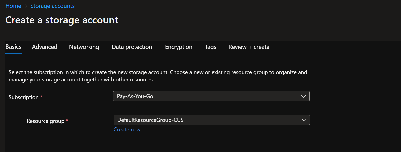 - In the Resource group field, select DefaultResourceGroup-CUS or create a new resource group by clicking Create new.