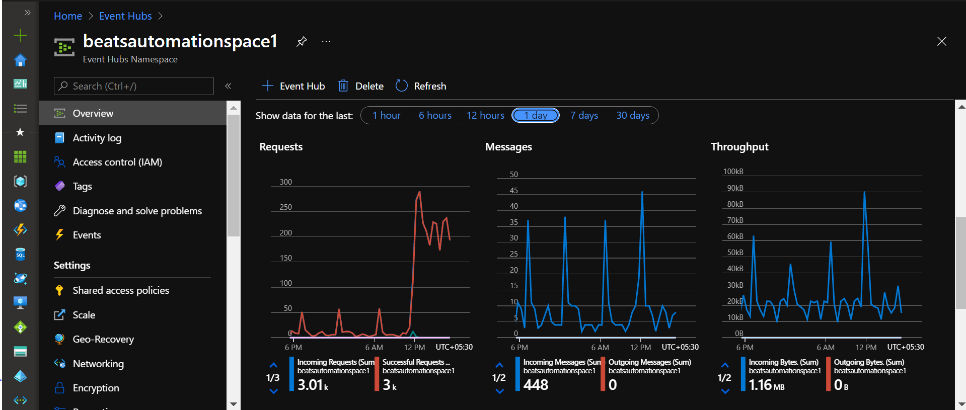 You can view metrics such as Messages and Throughput that help determine how much log data is flowing through a particular Event Hub.