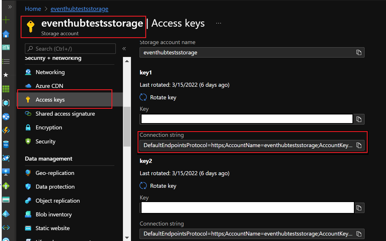In the menu of the selected (or newly created) storage account, click Access keys.