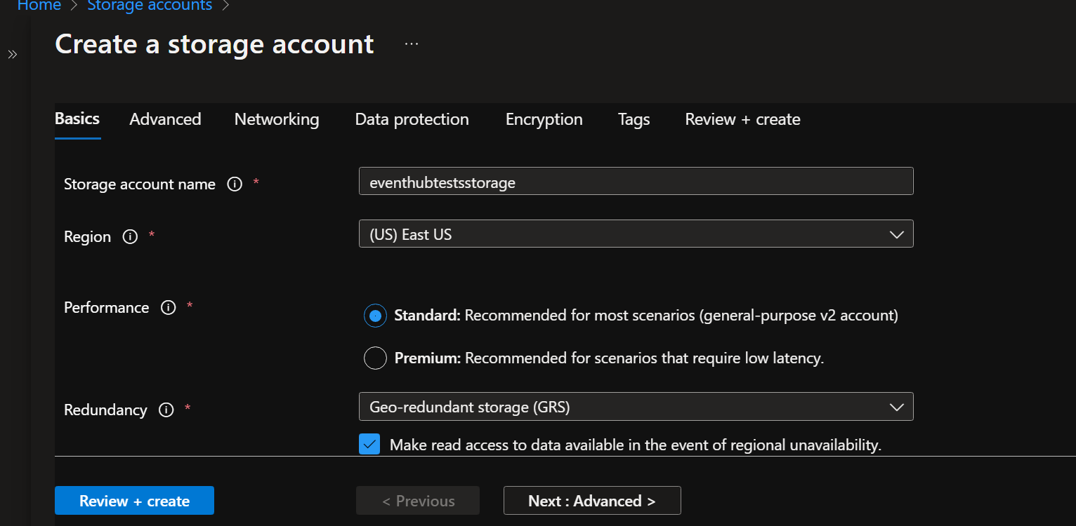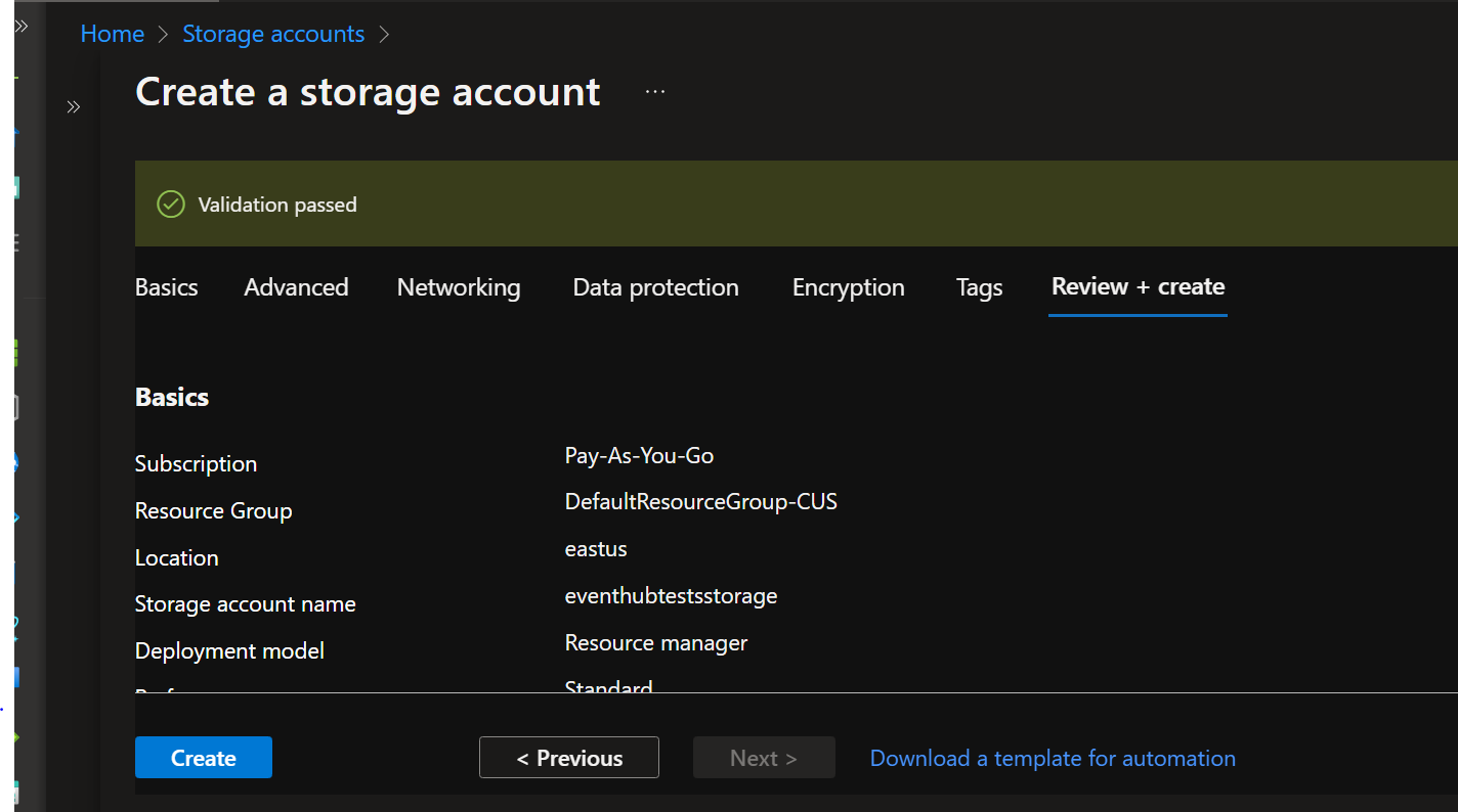 Azure Storage Account Connection String. This string keeps position and state information (what LogRhythm has collected so far from each Event Hub). The Event Hubs beat will use this storage account to create the storage container, if it is not already configured in the Azure portal within this storage account.