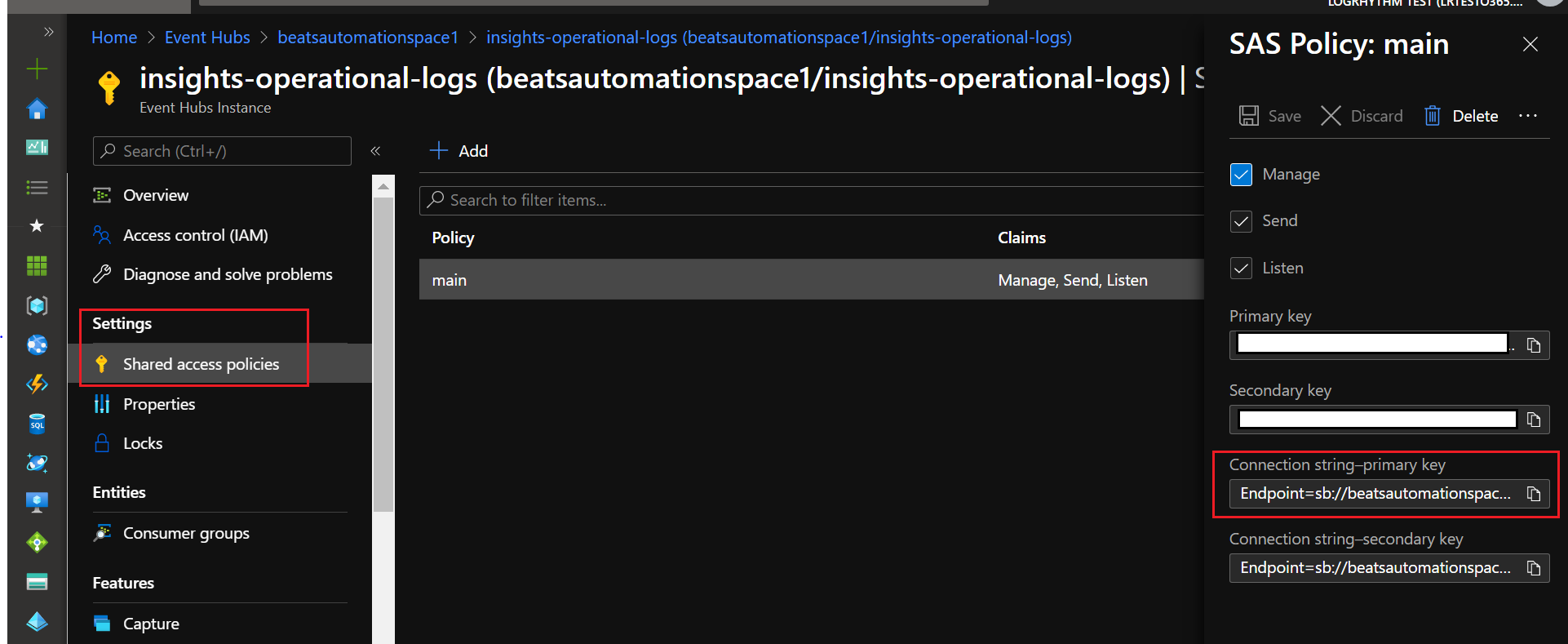 CODEEntityPath=insights-operational-logsThis string is added as a result of the Shared Access Policy being assigned within your Event Hub entity, as specified in step 4.