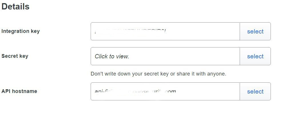 - In the Details section, your Integration key, Secret key, and API hostname are displayed. (This is required by the application that is going to request the logs).