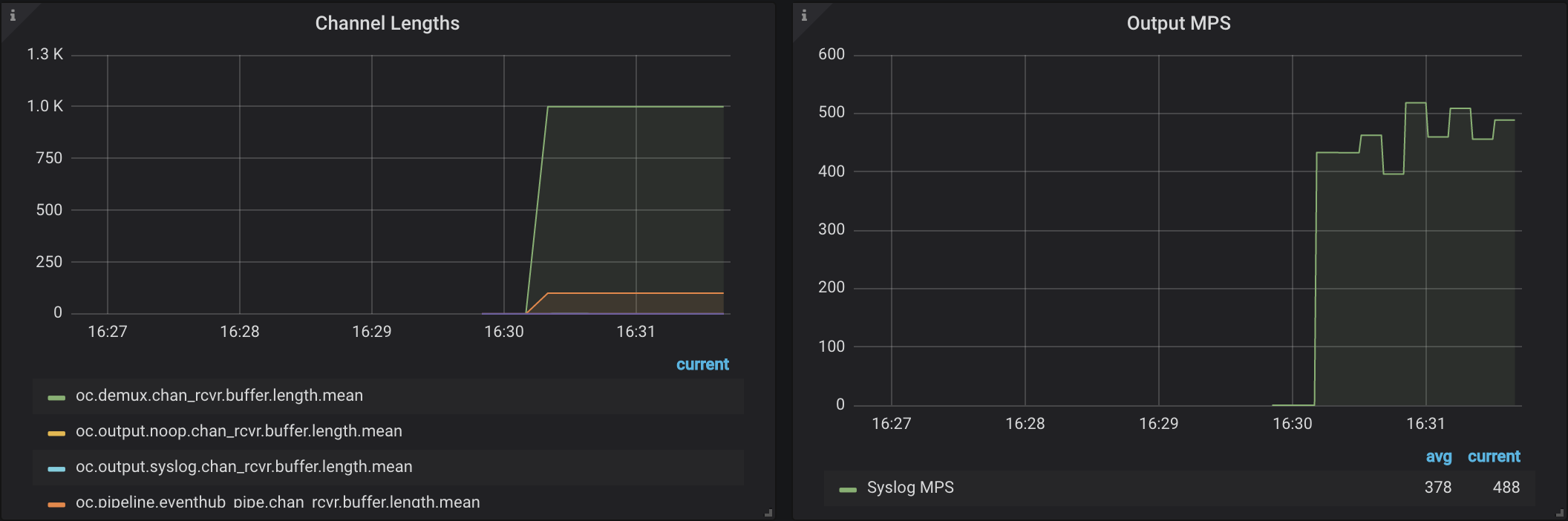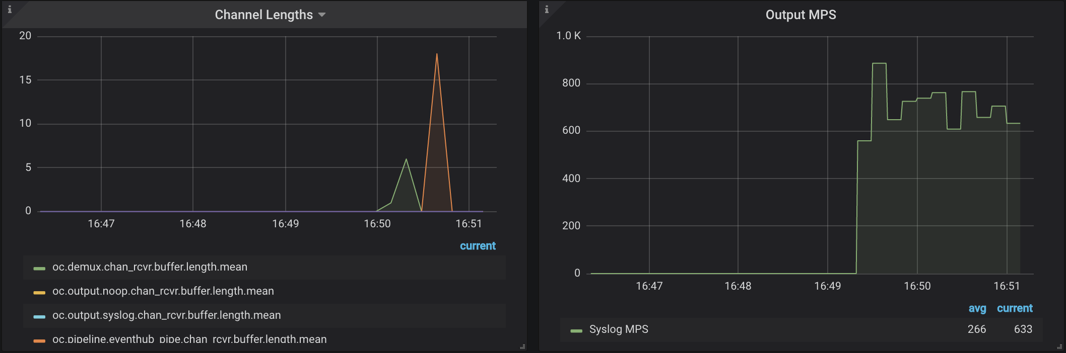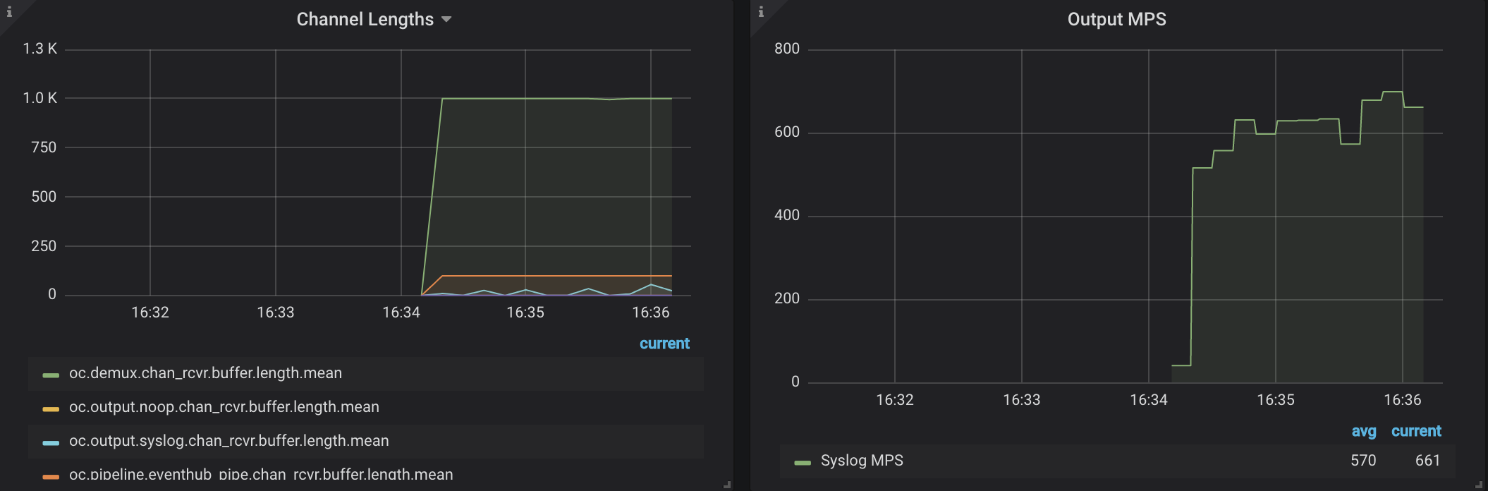 In the image below, channel lengths for oc.demux.chan_rcvr.* and oc.pipeline.eventhub.* are "flat-topped." This indicates sub-optimal performance and suggests that a bottleneck exists at the demux and pipeline components (the second prefix of the counter name).