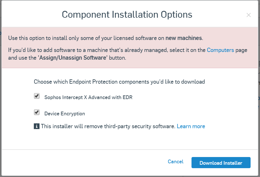 In some cases, you will be prompted to restart your system. Installation resumes automatically after your system restarts.- To verify the installation and registration in Sophos Central, from the menu on the left, select Endpoint Protection.