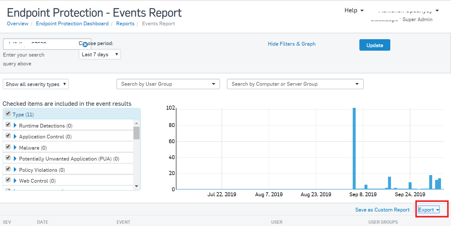 - To Export logs, on the bottom of the screen on the right, click Export.