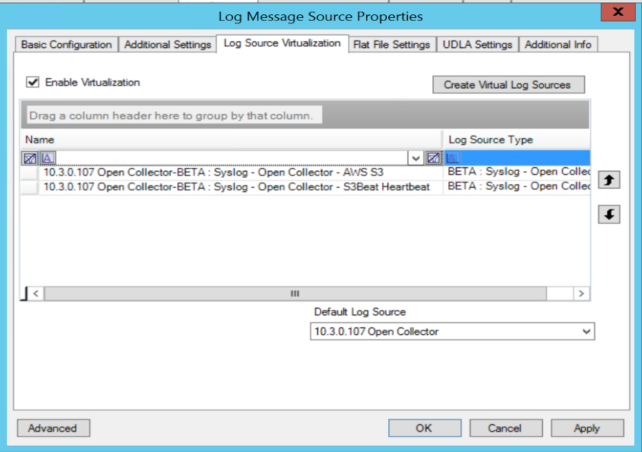 The Log Message Source Properties window appears.Click the Log Source Virtualization tab.