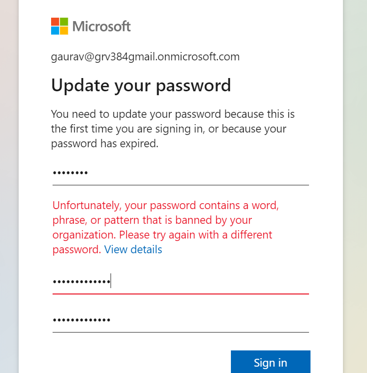 - After implementing all the step APP is applied on the all cloud user listed in azure directory. So whenever the user is tried to login or access the Enterprise application with banned password they are not allowed to login, as shown in the following example