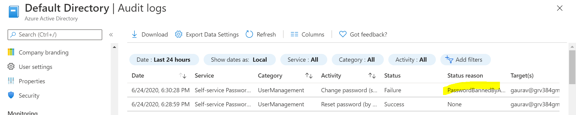 - Go to the Active Directory and select the audit log under monitoring