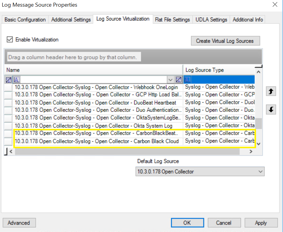 The Create Virtual Log Sources dialog box appears.In the Log Source Virtualization Template menu, select Syslog - Open Collector - Carbon Black Cloud.