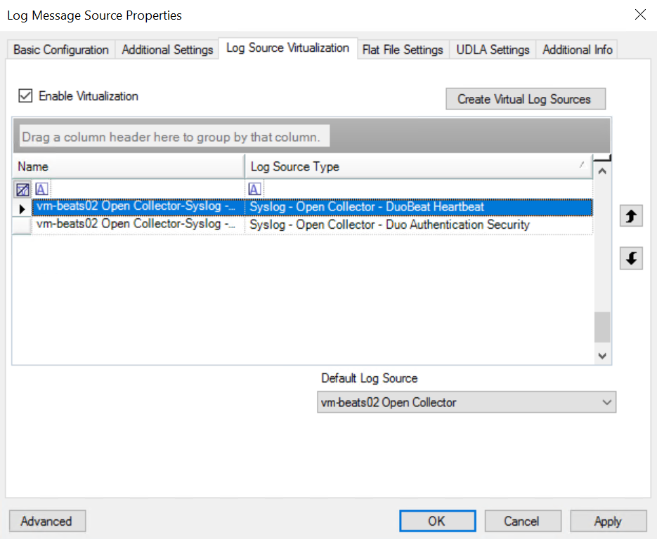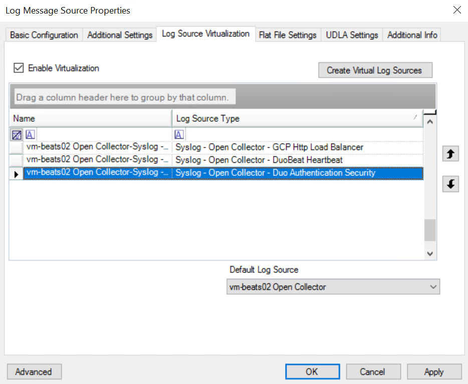 The Create Virtual Log Sources dialog box appears.In the Log Source Virtualization Template menu, select Syslog - Open Collector - Duo Authentication Security.