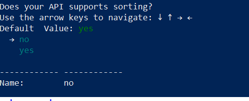 - Using the arrow keys, select no for API sorting support, and then press Enter.