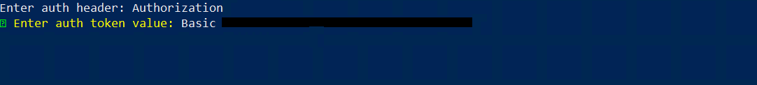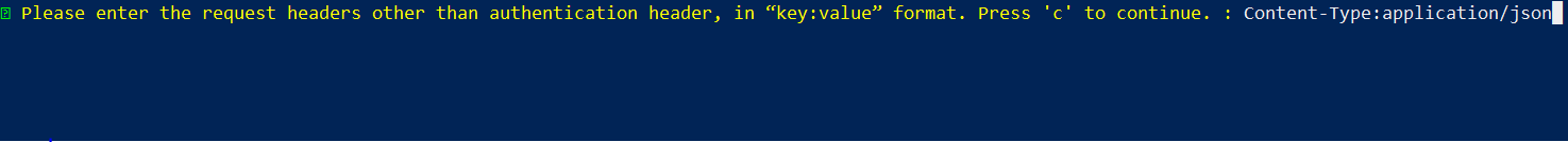 - Enter Content-Type:application/json as the request header other than authentication header, and then press 'c' to continue.