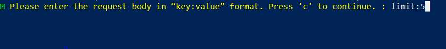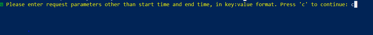 - Enter the request parameters (other than start time and end time) in the key:value format, and then press 'c' to continue.
