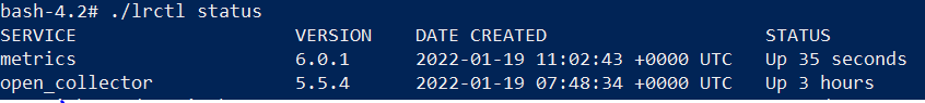 CODE./lrctl statusIf the Open Collector is not running correctly, see Troubleshoot the Open Collector in the Open Collector Installation and User Guide.