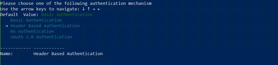 - Using the arrow keys, select Header Based Authentication as the authentication method, and then press Enter.