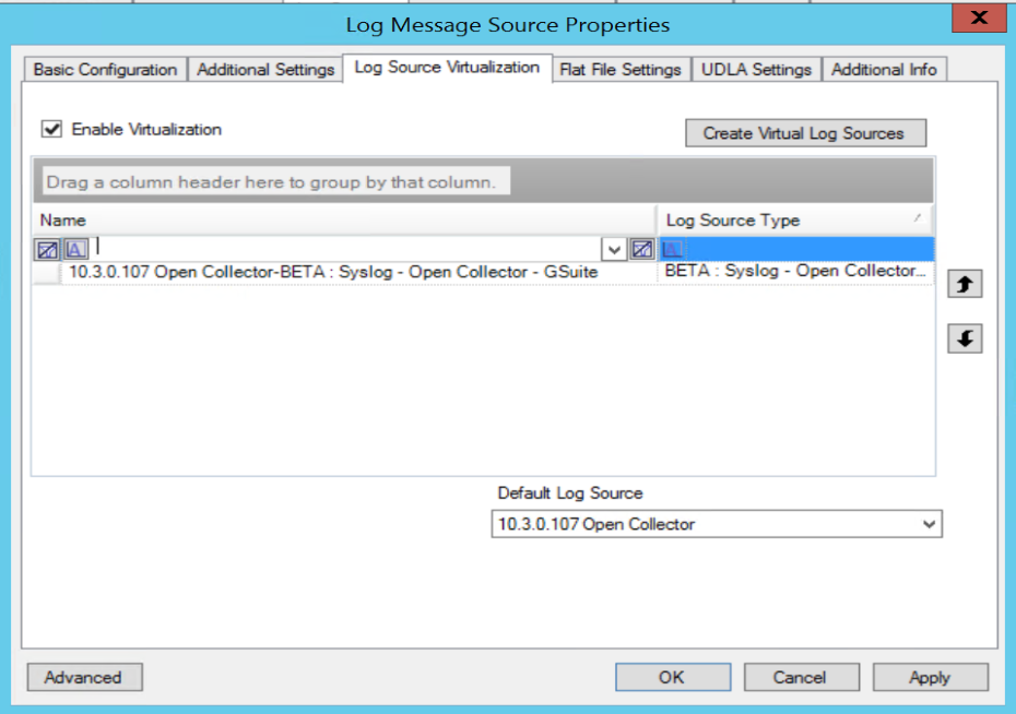 The Log Message Source Properties window appears.Click the Log Source Virtualization tab.