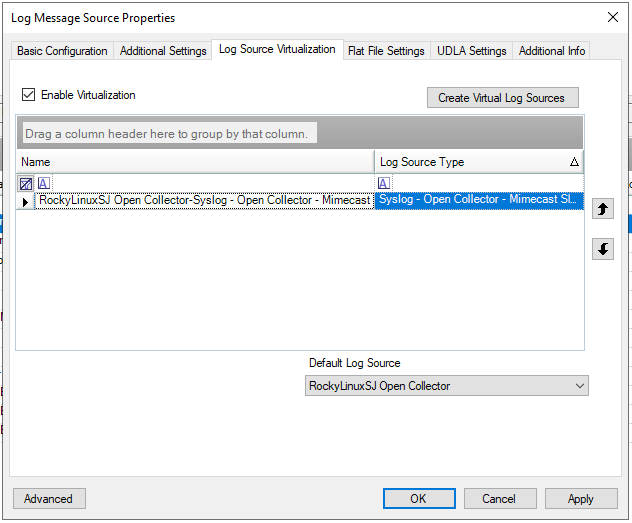 The Log Message Source Properties window appears.Click the Log Source Virtualization tab.