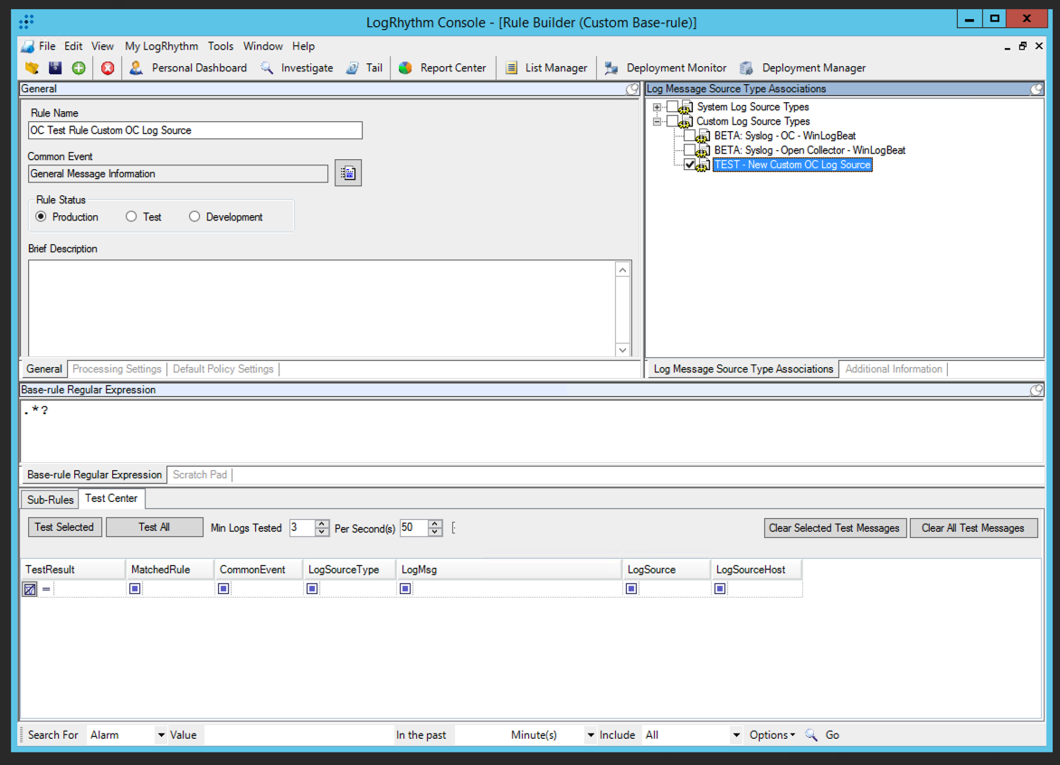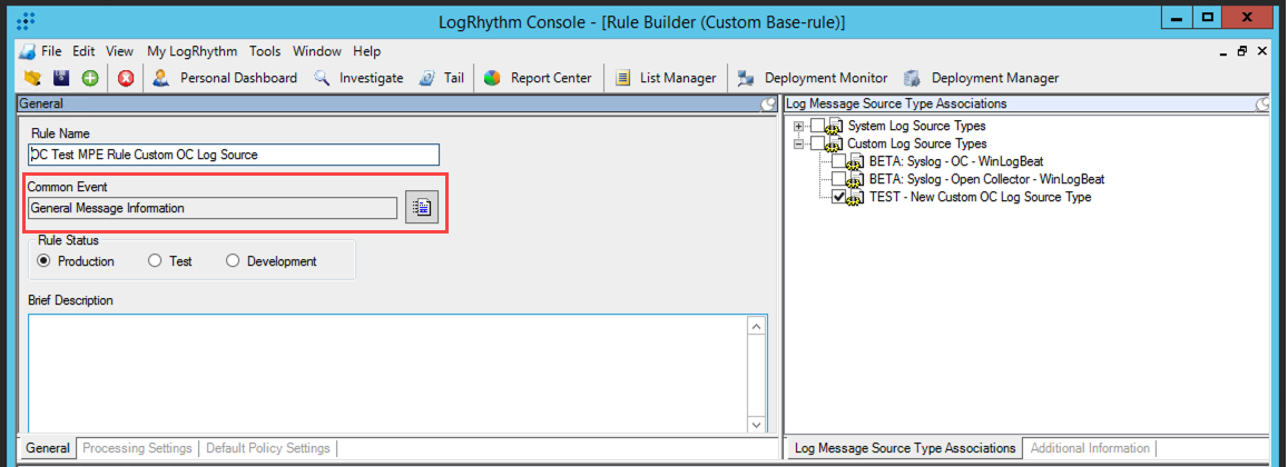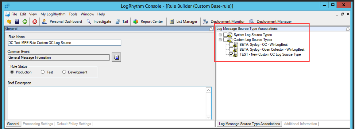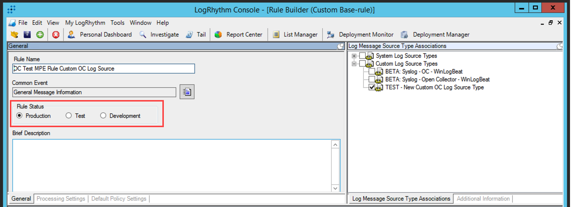 In the General section on the left, select Production in the Rule Status Field. Rules must be set to production for the log source type to be available in the Client Console.
