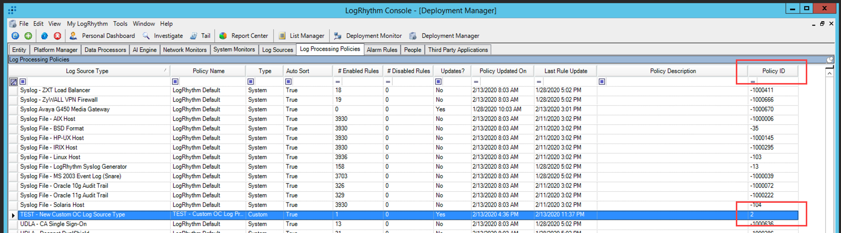 - In the Log Processing Policies grid, use the filters to find the policy you created.