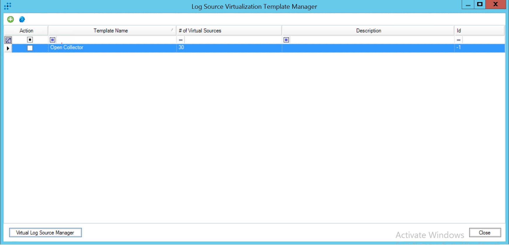 Verify the Open Collector template is already there in the Log Source Virtualization Template Manager, and verify the number of virtual log sources.