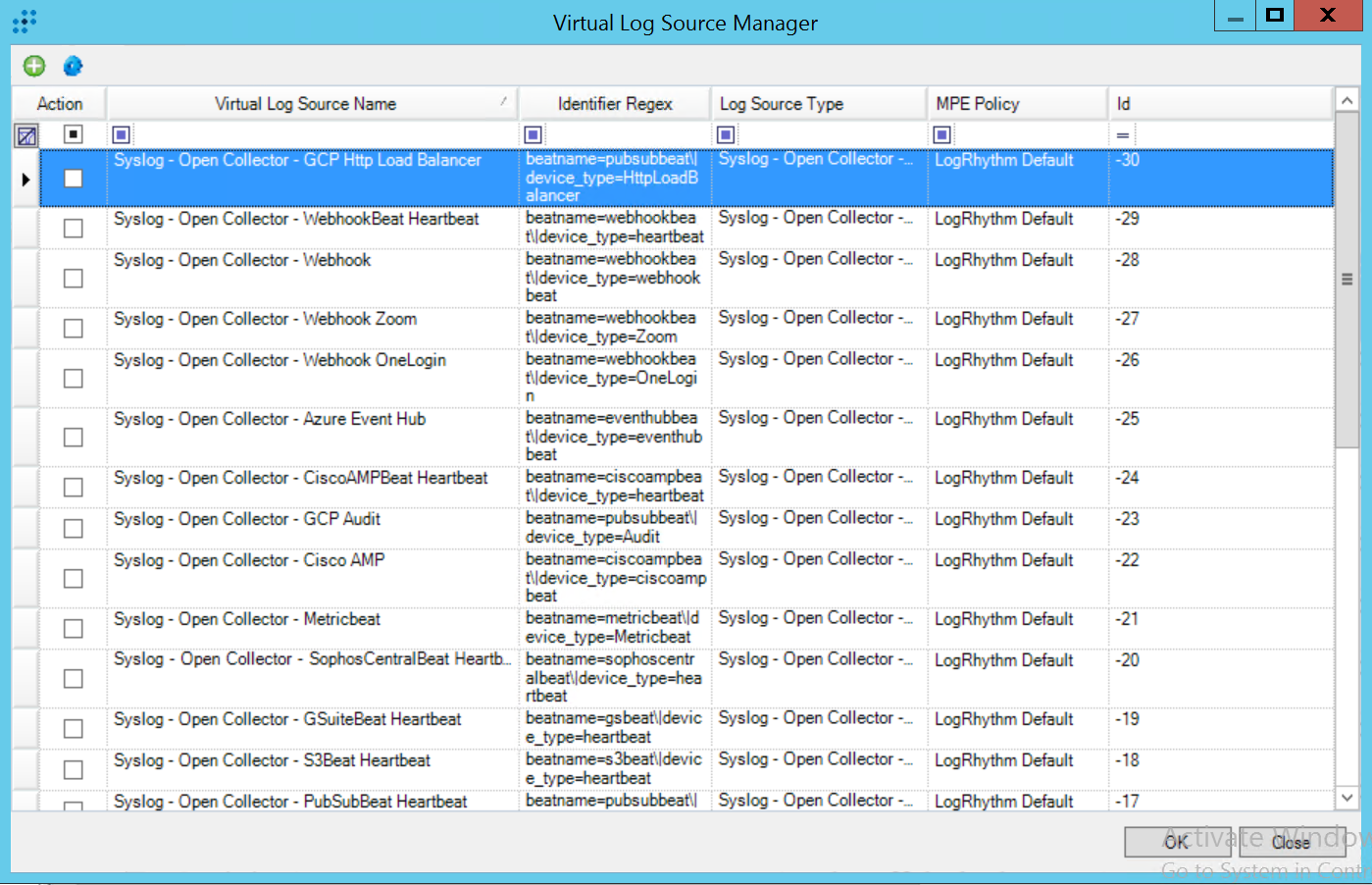 The Open Collector sends the output of every Beat to the Agent in a single syslog stream. The parent log source is a generic type: Syslog - Open Collector. A log source virtualization template included with the LogRhythm Knowledge Base (KB) creates child log sources for each beat.