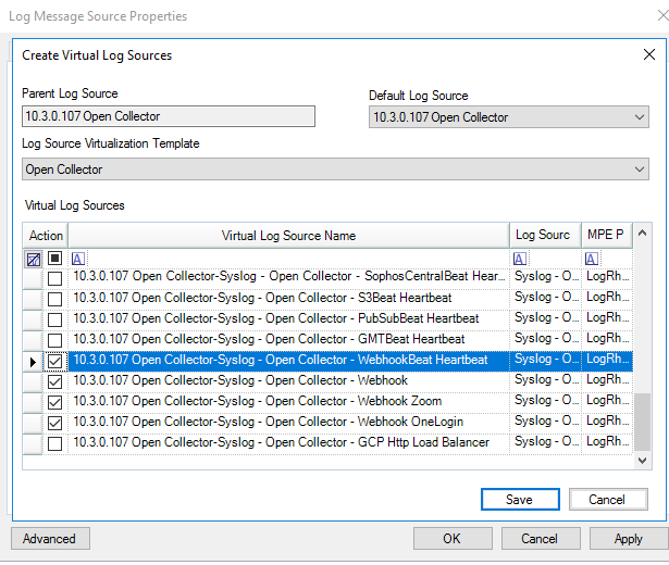 The Create Virtual Log Sources dialog box appears.In the Log Source Virtualization Template menu, select Syslog - Open Collector - Webhook.