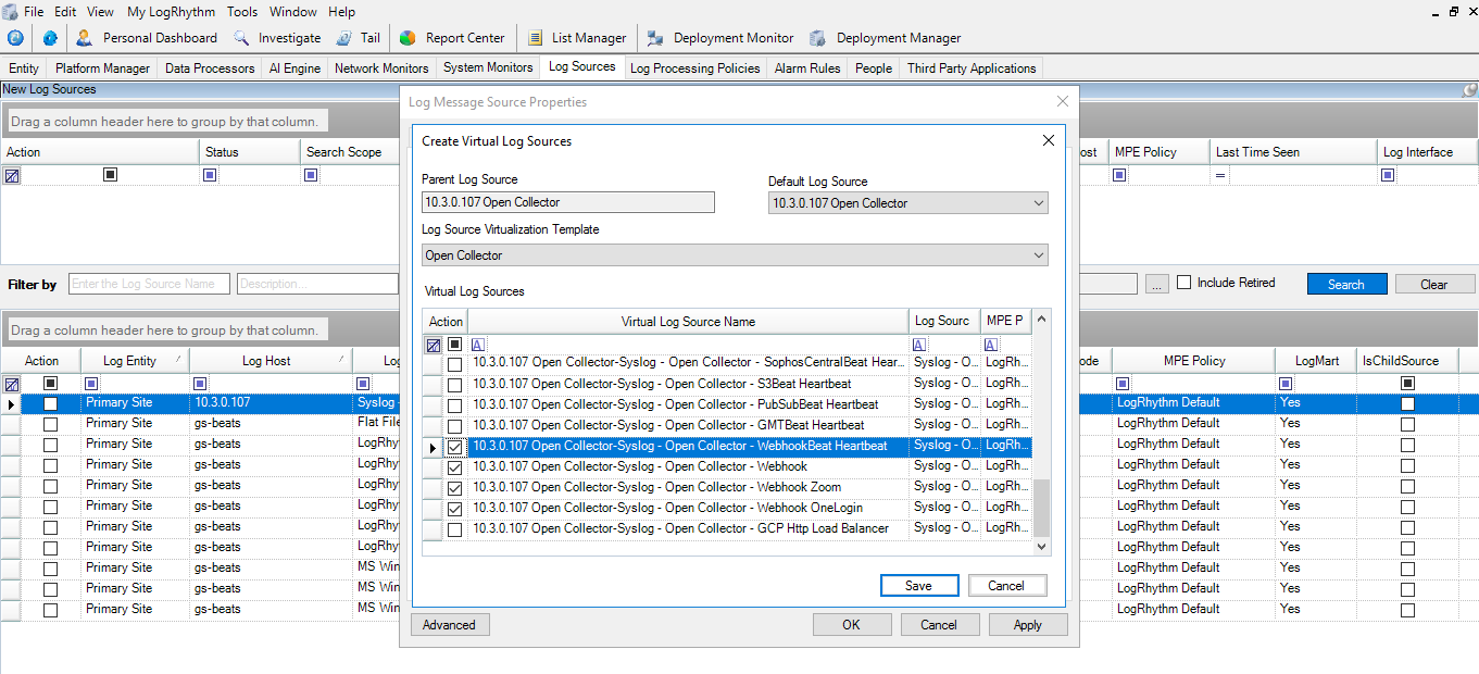 Do not select the Webhook-specific log source types yet. You will do that in a later step.Log Processing Policy. LogRhythm Default
