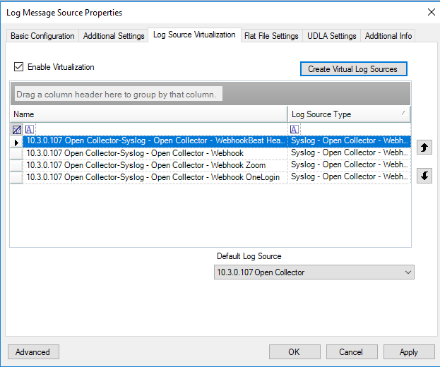 The Log Message Source Properties window appears.Go to the Log Source Virtualization tab.