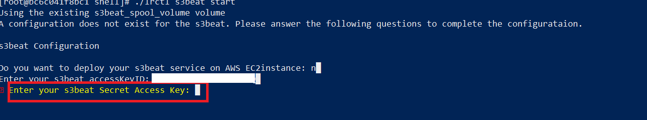 Enter the access key of your s3beat AWS application, which you should have saved from the Configure AWS S3 section.