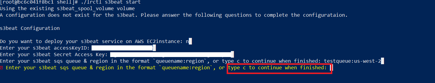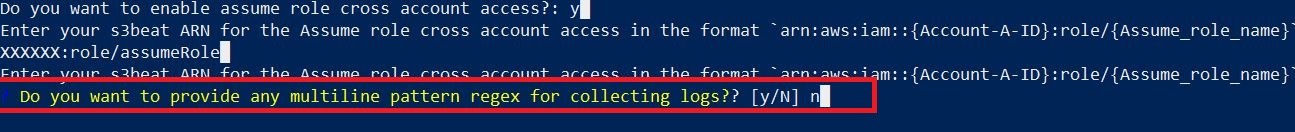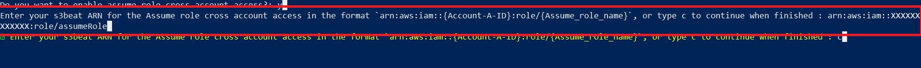 - Enter your s3beat ARN for the assume role cross account access in the mentioned format. You can enter multiple ARNs. When you have finished entering your ARNs, type c.
