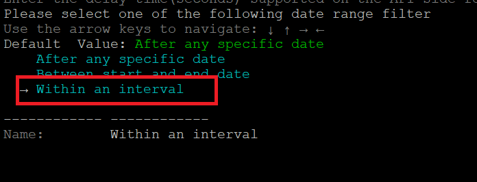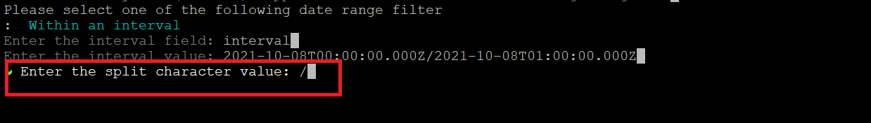- Enter the request parameters (other than start time and end time) in the key:value format, and then press 'c' to continue.