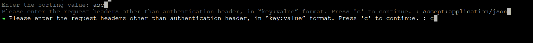 - Enter the request headers (other than the authentication header) in the “key:value” format, and then press 'c' to continue.