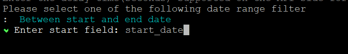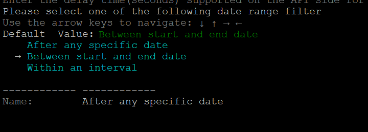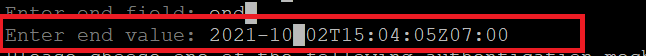 - Enter the request parameters (other than start time and end time) in the key:value format, and then press 'c' to continue.