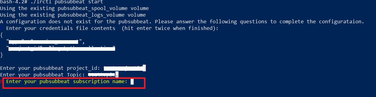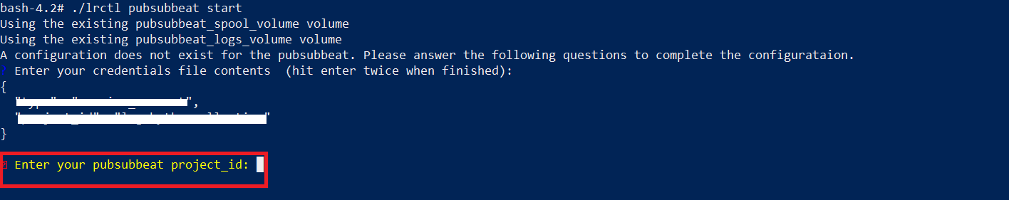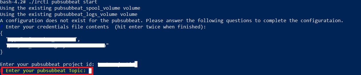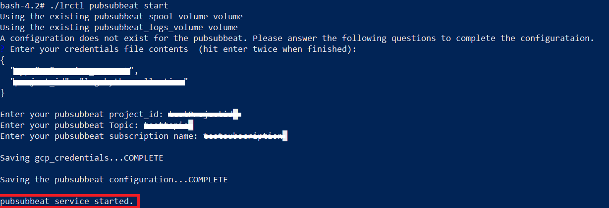 CODE./lrctl pubsubbeat startEnter the following details: