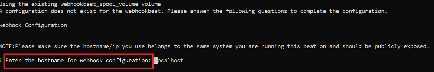 If you provide your own hostname/external IP, make sure it is publicly exposed on the specified port and is mapped to the same system on which the beat is running. If you are running multiple webhook beat instances, you must run each instance on a different port. One beat instance should use one unique port on the same machine, otherwise the beat will not work.