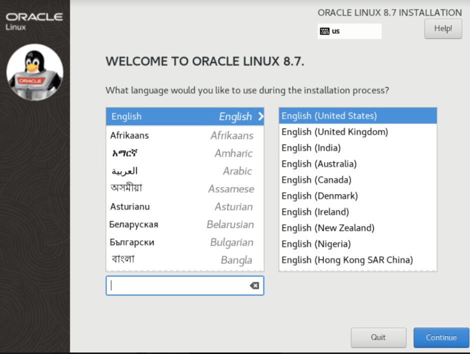 - Once the Oracle Linux 8.7 installer GUI starts, select your language localization settings.