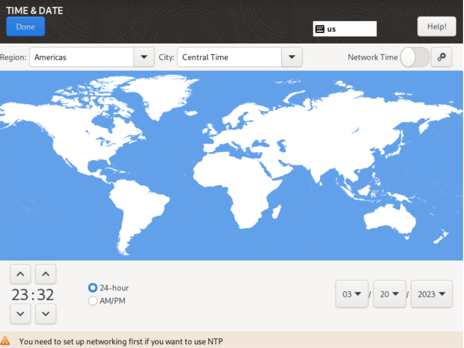 You can also use the Network Time (NTP) option (networking must be configured to use this option).- In the upper-left corner, click Done.