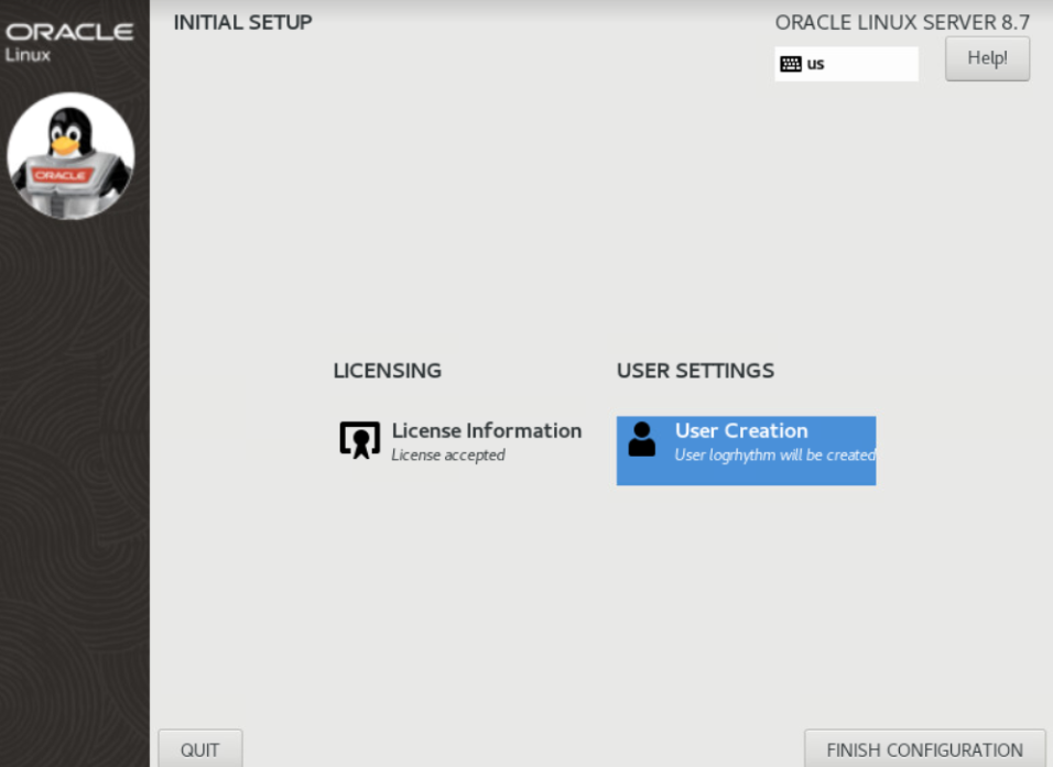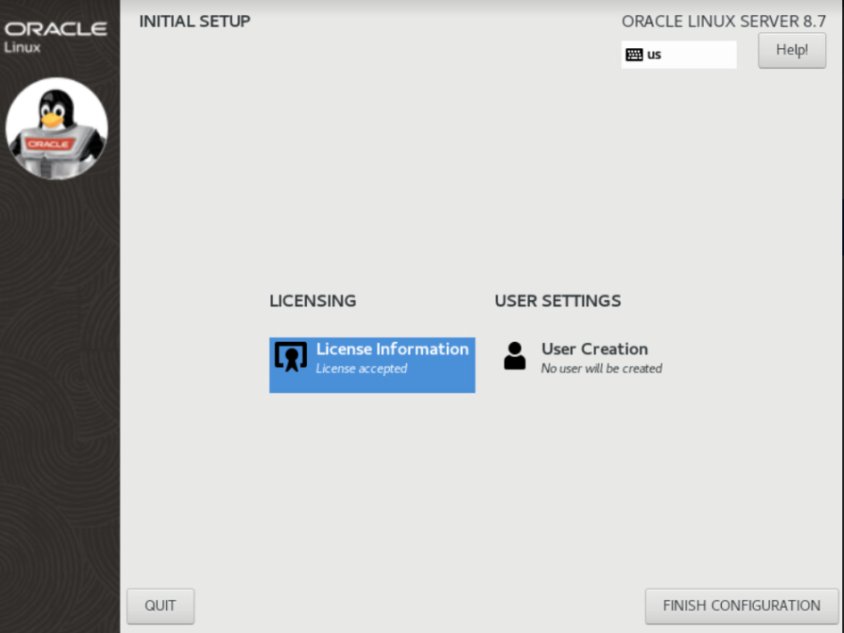 The INITIAL SETUP screen appears after reboot. Accept the License Agreement and click User Creation.