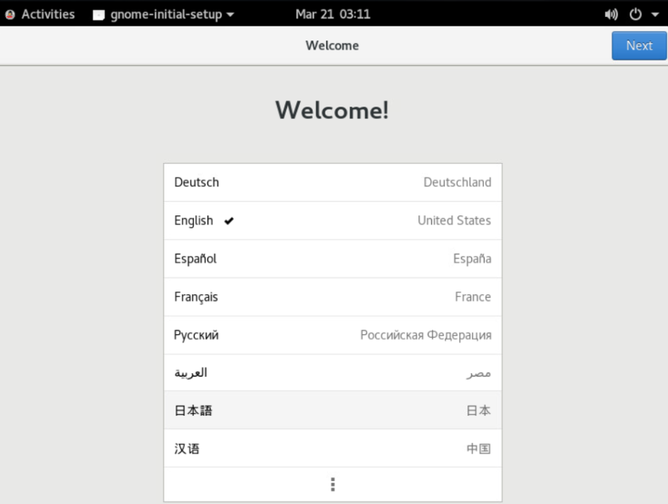 The Welcome screen appears.- Select your preferred language and click Next in the top-right corner.