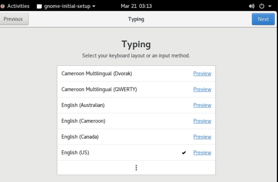 The Typing window appears. - Select your preferred keyboard layout and click Next in the top right corner.