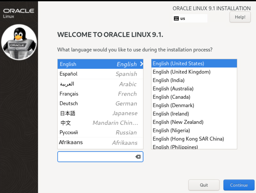- Once the Oracle Linux 9.1 installer GUI starts, select your language localization settings.
