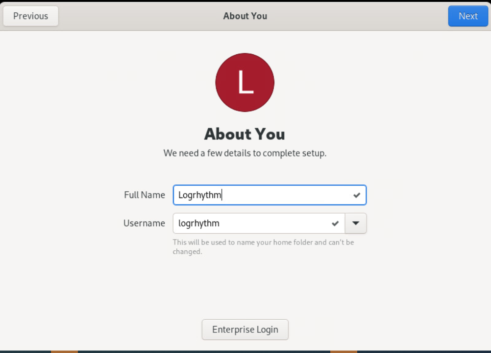 The About You window appears. - Enter appropriate details for a logrhythm user and click Next in the top-right corner.