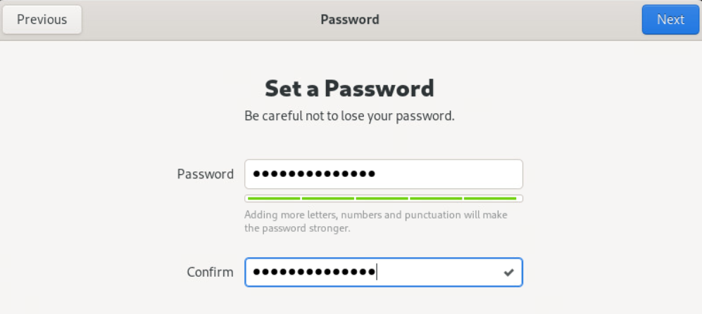 The Password window appears. Enter a strong password, and then click Next in the top-right corner.