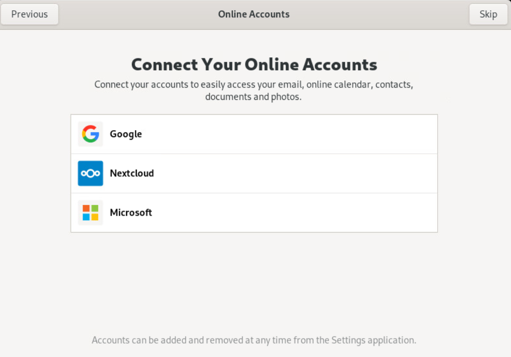 The Online Accounts window appears. - Optionally, configure your online account, or click Skip in the top right corner.