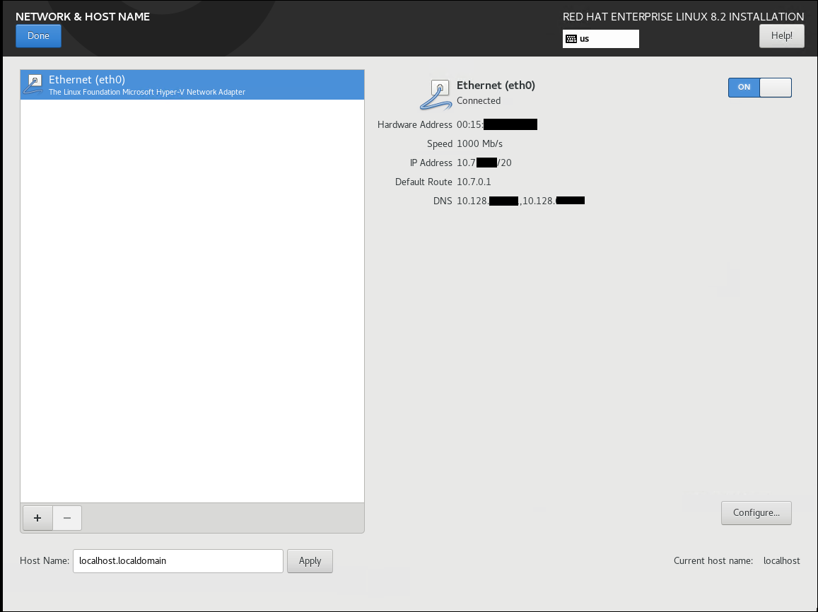 The VM retrieves an IP address and DNS settings using DHCP (IPs and MAC redacted for security reasons). - In the upper-left corner, click Done.