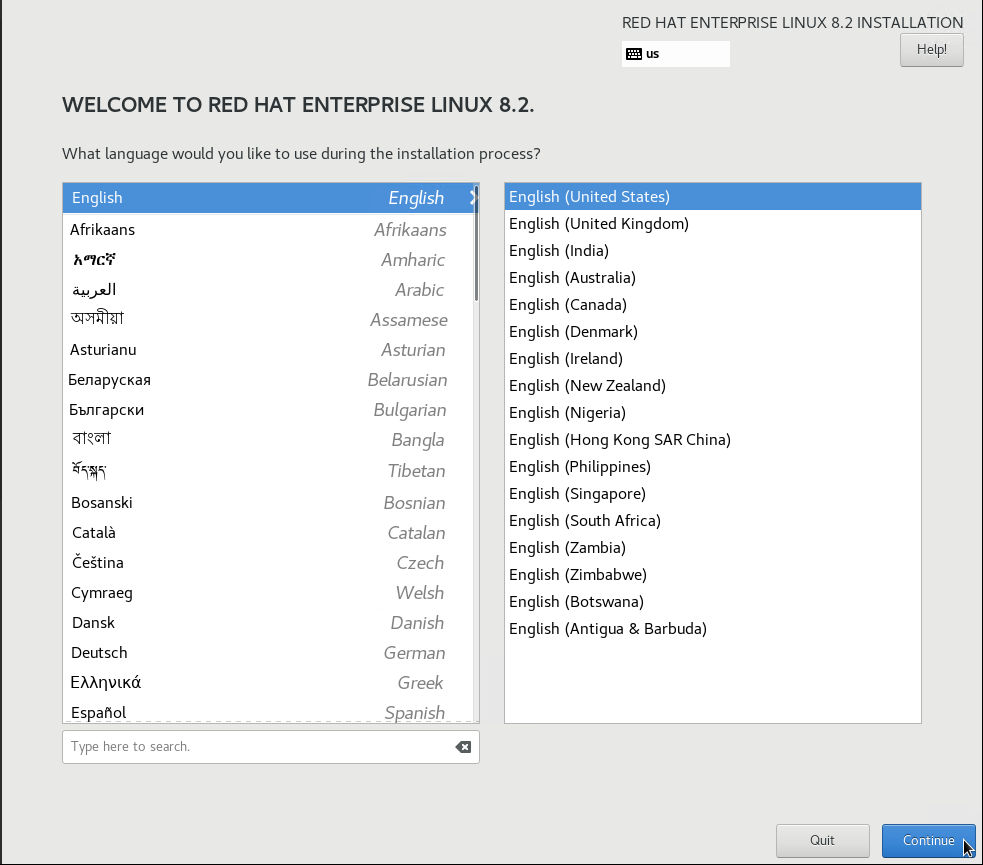 - Once the Red Hat installer GUI starts, select your language localization settings, and click Continue.