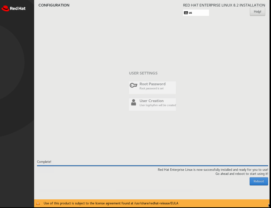 You can also create a logrhythm user manually after installation.Once installation is complete, click Reboot in the lower-right corner.